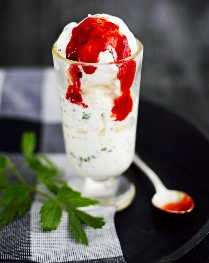 Jälkiruuassa piilee yllätys: lipstikka. Yrttiparka on turhaan lihaliemimausteen maineessa, joten sitä kannattaa ehdottomasti kokeilla vaniljajäätelön mausteena. Jäätelön kanssa tarjottava mansikkakastike puolestaan raikastuu rosmariinilla. Yllättävää ja ehdottomasti kokeilemisen arvoista!