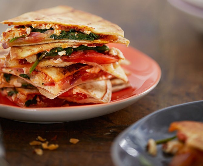 Rakenna lämpimät quesadillat tortilloista. Sipaise pintaan peston tai salsakastikkeen loput, murenna joukkoon fetaa, mozzarellaa tai raejuustoa, silppua joukkoon kasviksia ja raasta päälle reilusti juustoa. Vegeversion rinnalle teet helposti lihaisamman. Upota väliin edellisen päivän kypsää broileria kuin ruskistettua jauhelihaa. Viilaa makua tuoreilla yrteillä. Silppua joukkoon oman makusi mukaan basilikaa, timjamia tai mäkimeiramia.