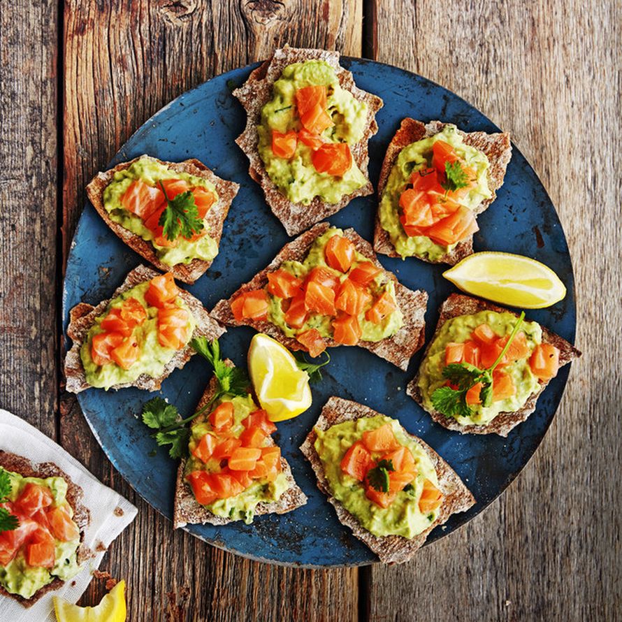 Tarjoa alkupalaksi rennosti näkkileipiä, jonka päällä on avokado-piparjuuritahnaa ja lohta.