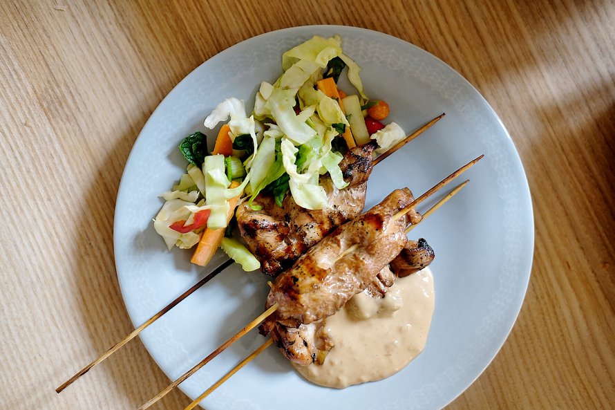 Sekoita kaikki ainekset kulhossa ja notkista vesitilkalla , kunnes kastike on sopivan notkeaa. Tarjoile grillatut kanavartaat pähkinätahnan kanssa.