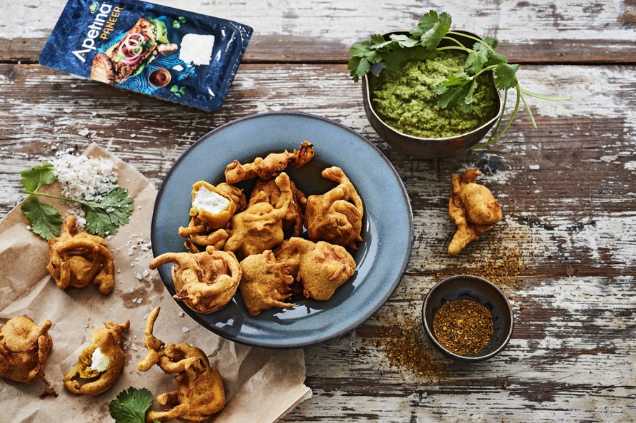Paneer-pakorat ovat intialaisen keittiön herkuimpia juttuja. Dippaa pallurat raikkaaseen herneminttudippiin.