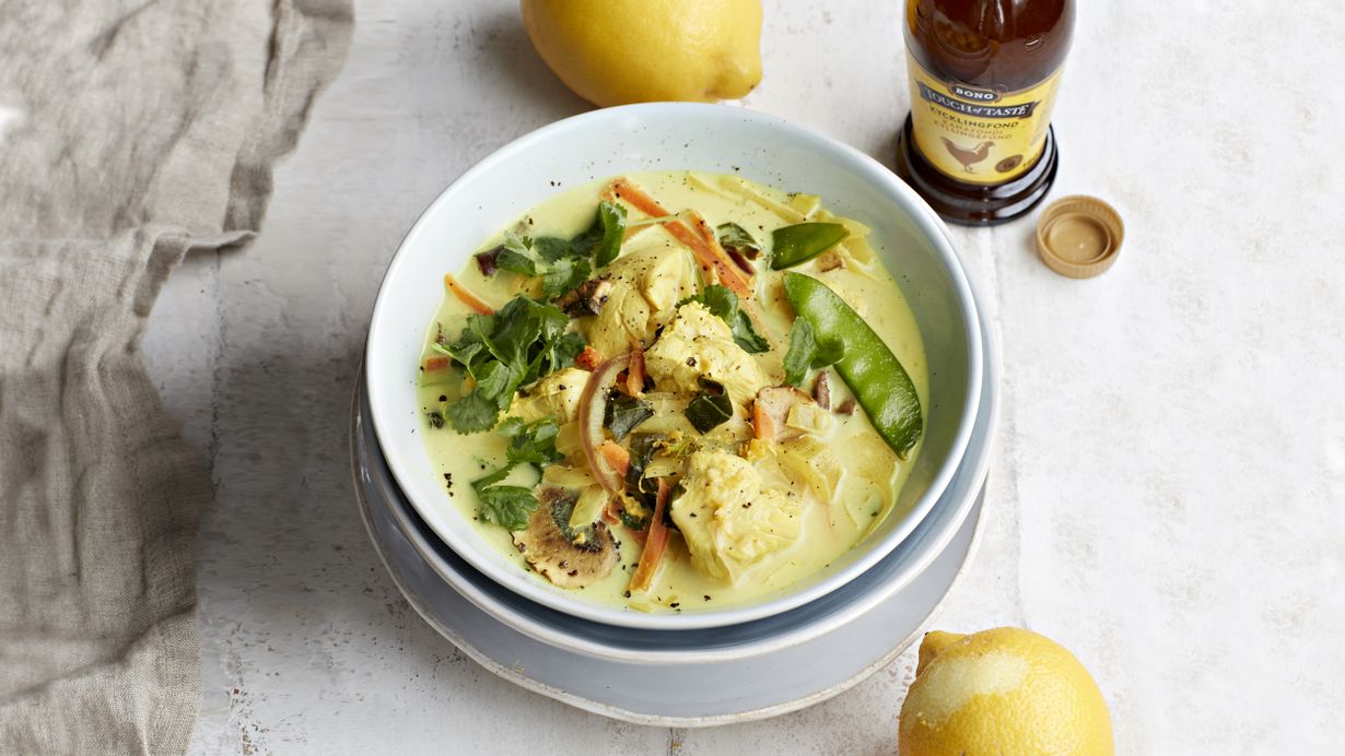 Pese sitruuna, raasta kuori ja purista mehu. Kiehauta vesi kattilassa. Lisää Touch of Taste -kanafondi, broilerinfileesuikaleet, kasvissuikaleet, sitruunan kuoriraaste ja -mehu sekä hunaja. Kiehauta ja keitä 10 minuuttia. Lisää ruokakerma tai kookoskerma. Kuumenna.