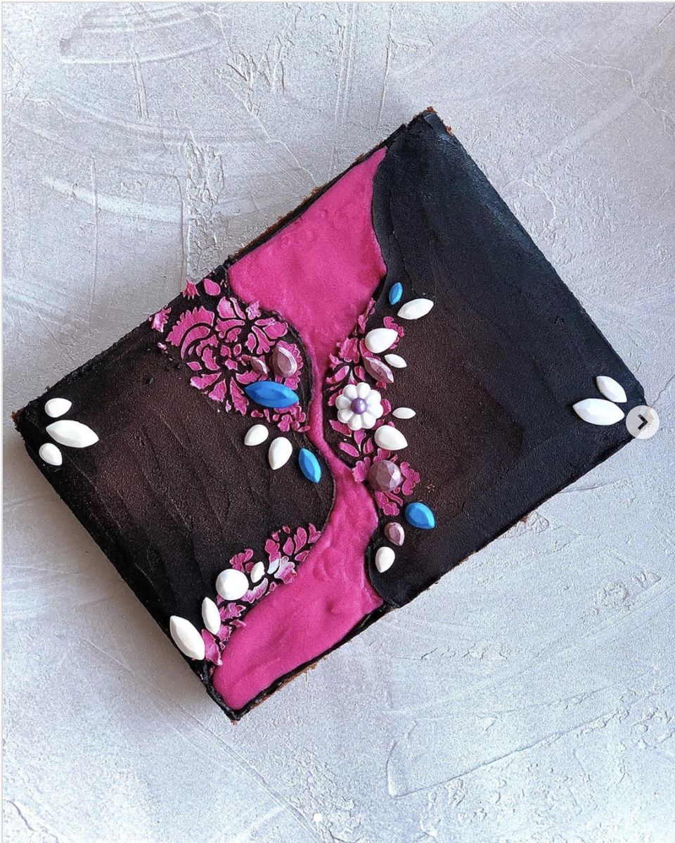 Amanda: Tässä on yhdistetty kahta eri kuorrutetta ja viimeistelty sabluunalla tehdyillä ruusukuvioilla. Timantit koristelussa ovat piste i:n päälle.