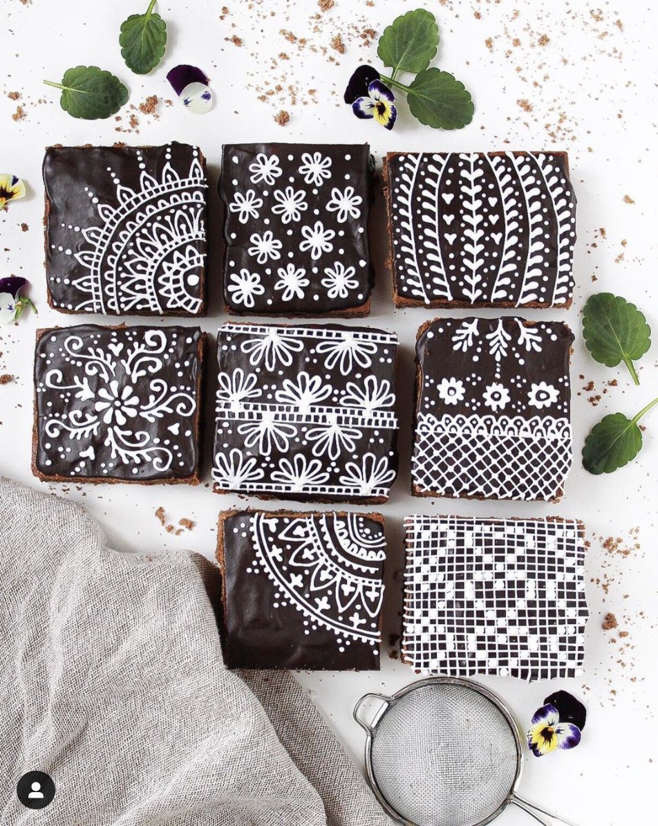 Amanda: Nämä ovat periaatteessa perinteiset mokkapalat, mutta kuorrutteen päälle on aivan upealla käsityöllä pursotettu pikeerillä ihanat pitsikuviot. Jokainen pala on yksilöllinen.