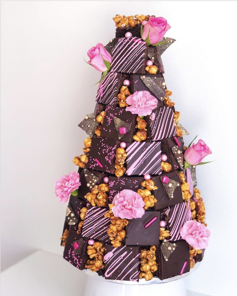 Amanda: Aivan upea mokkapalatorni! Mokkapaloja on kiinnitetty karamellisoiduin popcornein. Lisäksi on käytetty aitoja kukkia. Tämä sopisi vaikka hääkakuksi.