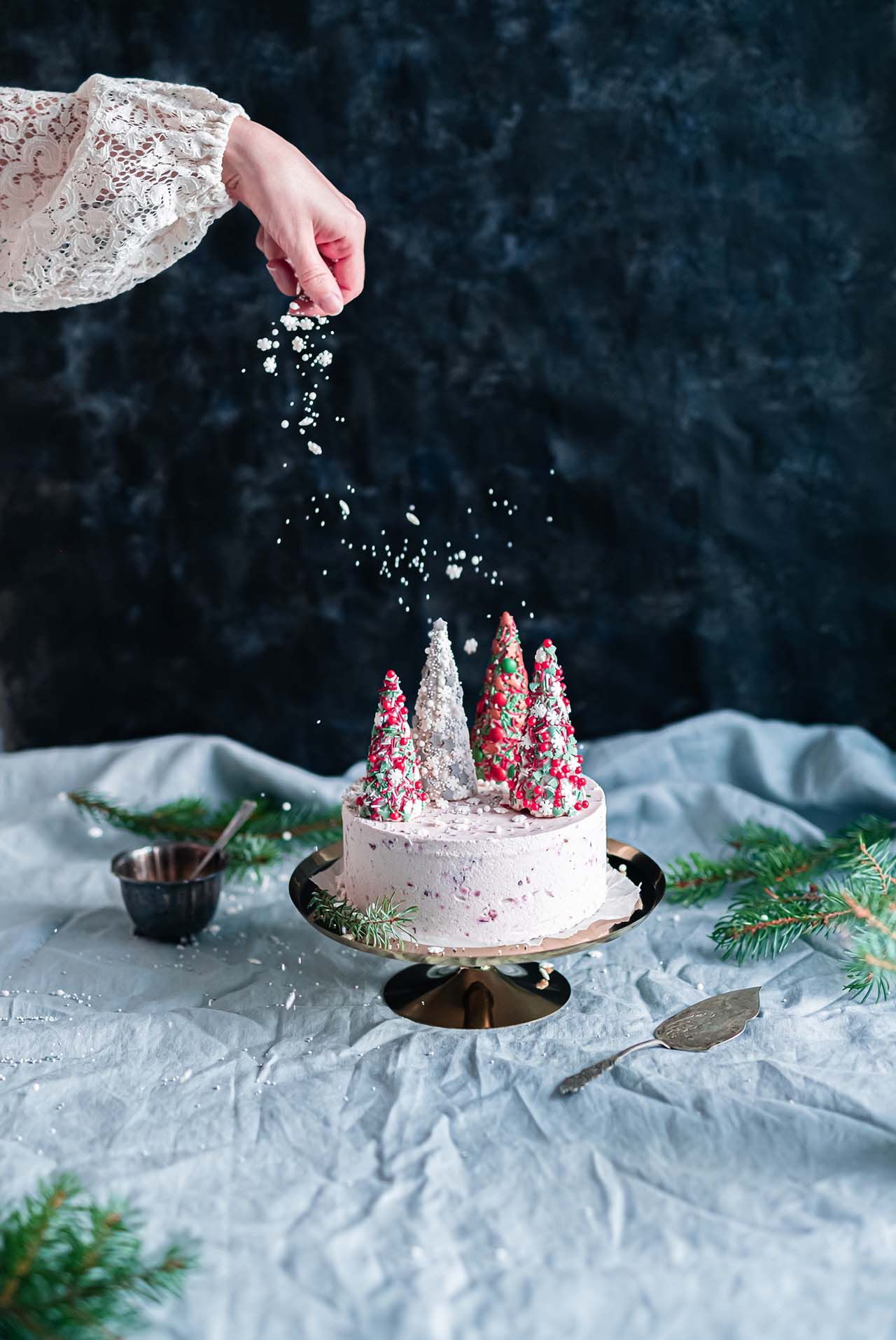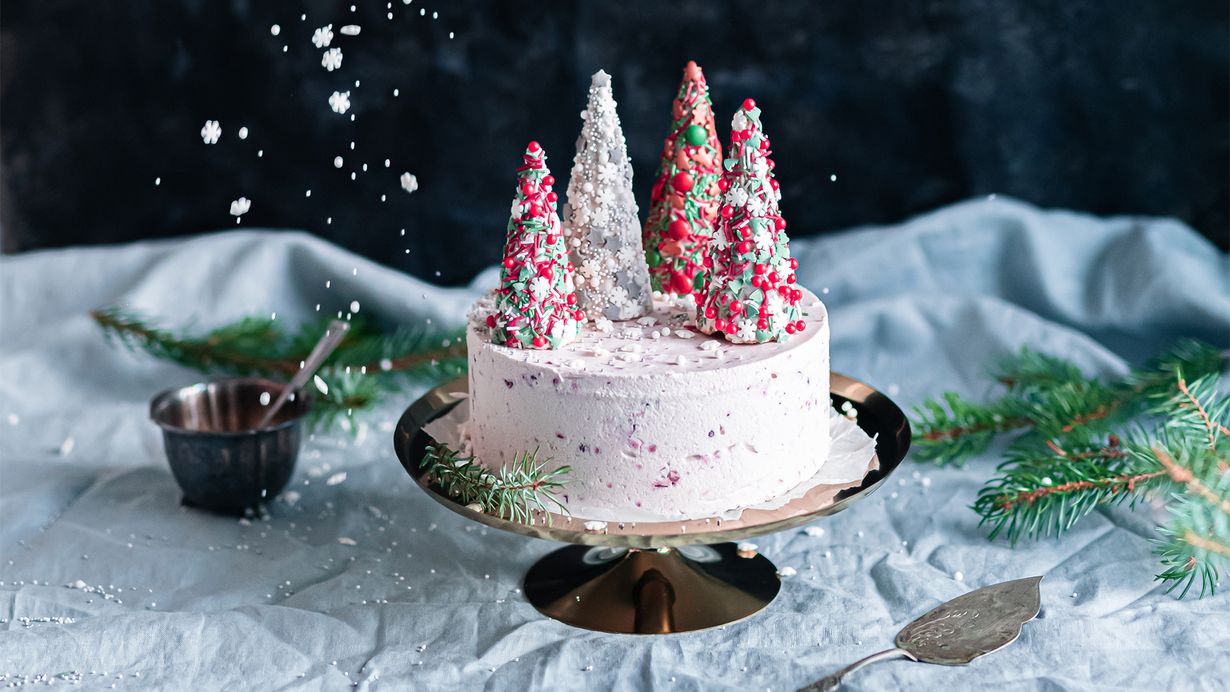 Puolukkajäätelökakku joulukuusikoristeilla