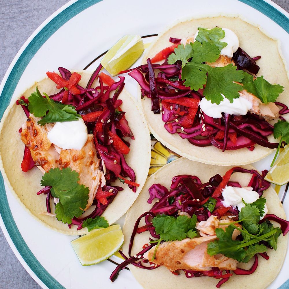 4. Leikkaa kala viipaleiksi. Tarjoa pehmeiden tortillojen, limelohkojen ja tuoreen korianterin kanssa.