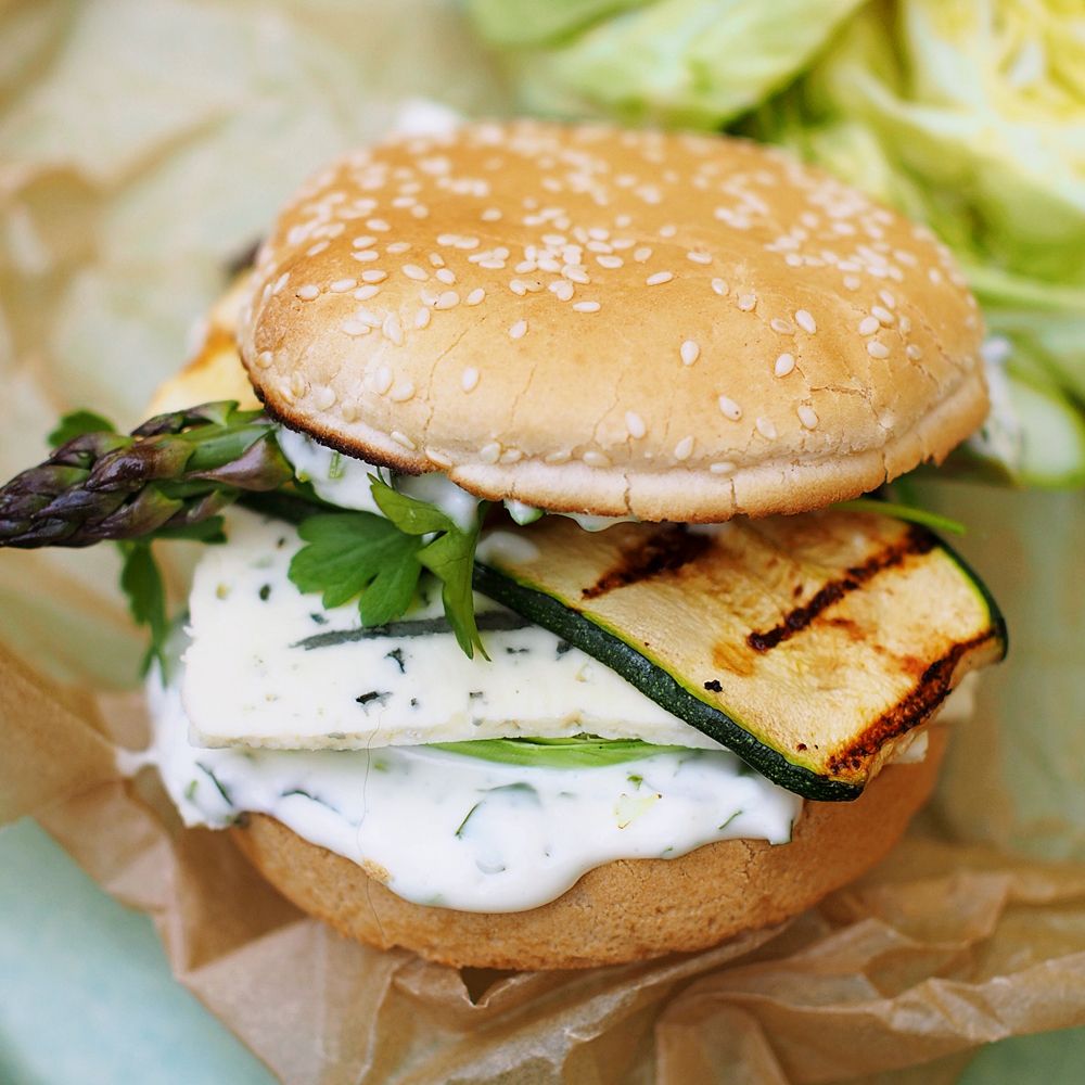 3. Paahda halkaistuja sämpylöitä grillissä hetki. Kokoa burgerit: voitele sämpylät majoneesilla, lisää alimmaksi kaalikiekko, päälle kesäkurpitsaa, parsaa ja juustoa. Tarjoa heti.