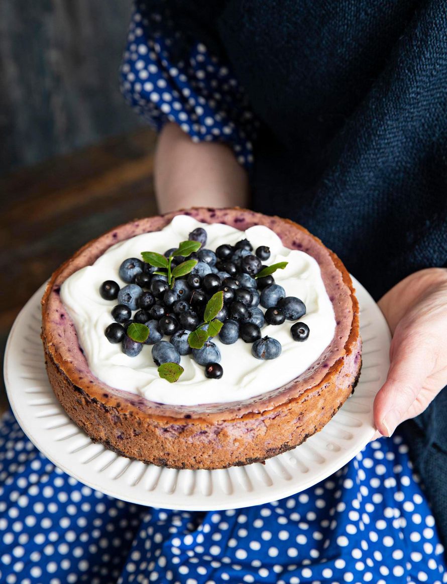 Tämän muhkean juustokakun juju on sitruunaisessa mustikkasoseessa. Kippaa kuorrutteen päälle vielä kunnon keko marjoja ja lopputulos on täydellinen.