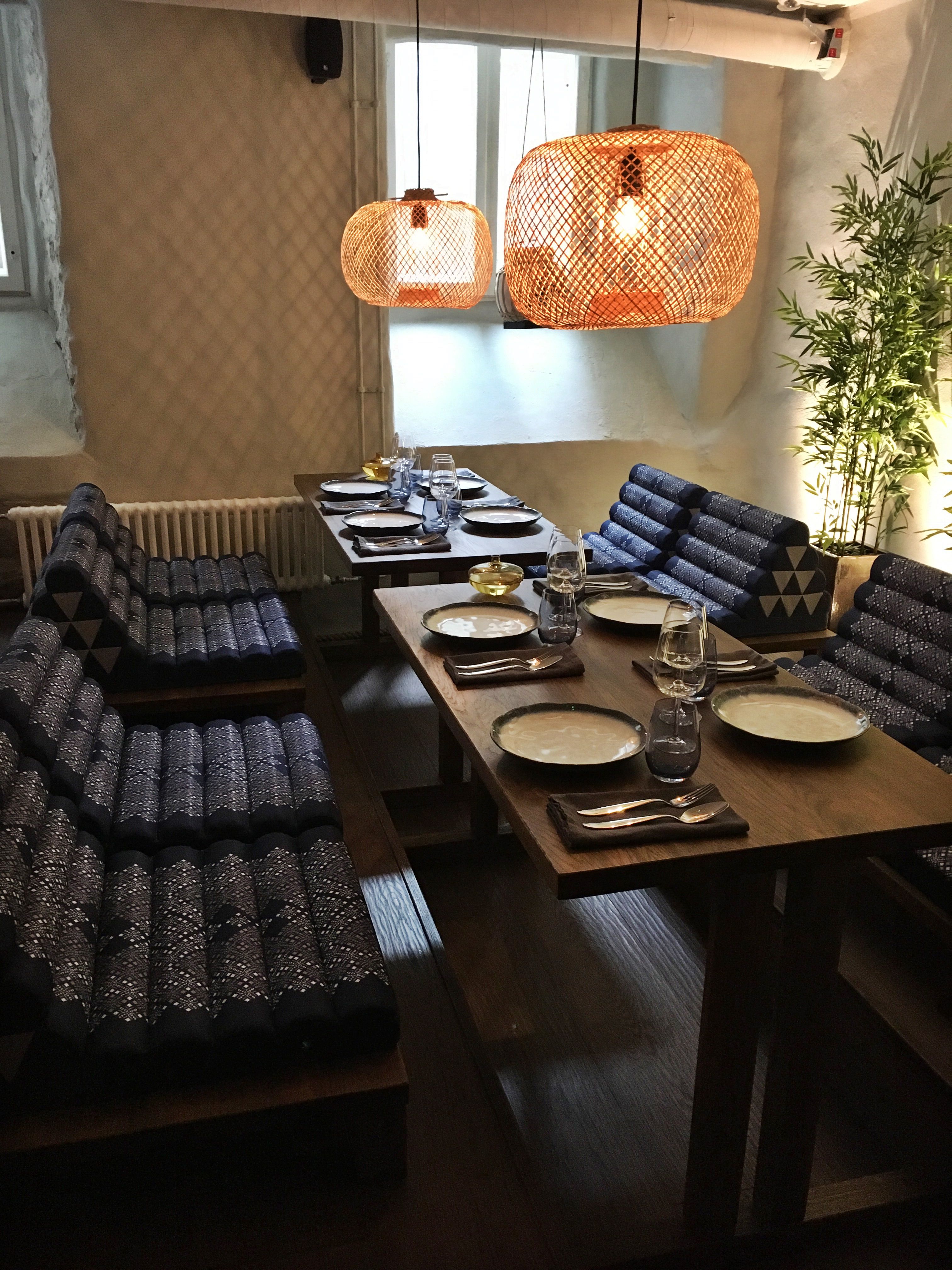 Sokkeloiseen vanhaan rakennukseen perustetussa ravintolassa on pieniä ruokasaleja, joita on mahdollista yhdistää ja erotella verhoilla seurueiden koon mukaan. Ruokasaleista houkuttavin on nojatuolimaisin mattoistuimin sisustettu Kantok-huone.
