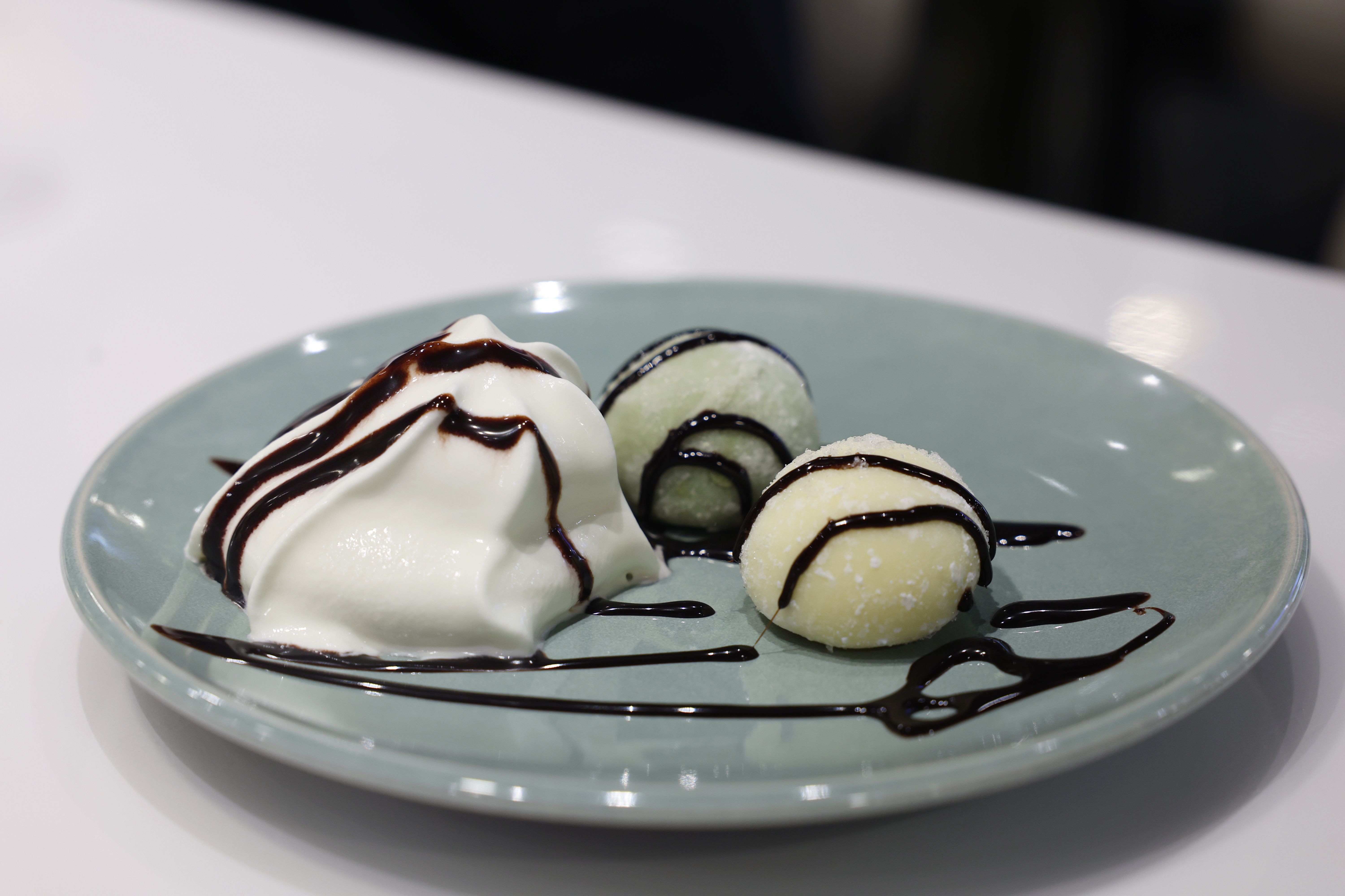 Jälkiruoaksi vielä japanilaiset jäätelömochit. Vaniljan ja matcha-teen makuiset pallurat saapuvat pöytään kermavaahdon ja suklaakastikkeen kera. Niissä jäätelö on riisitärkkelyksestä valmistetun taikinan sisällä. Lopetus on raikas, hauska ja mieleenpainuva.