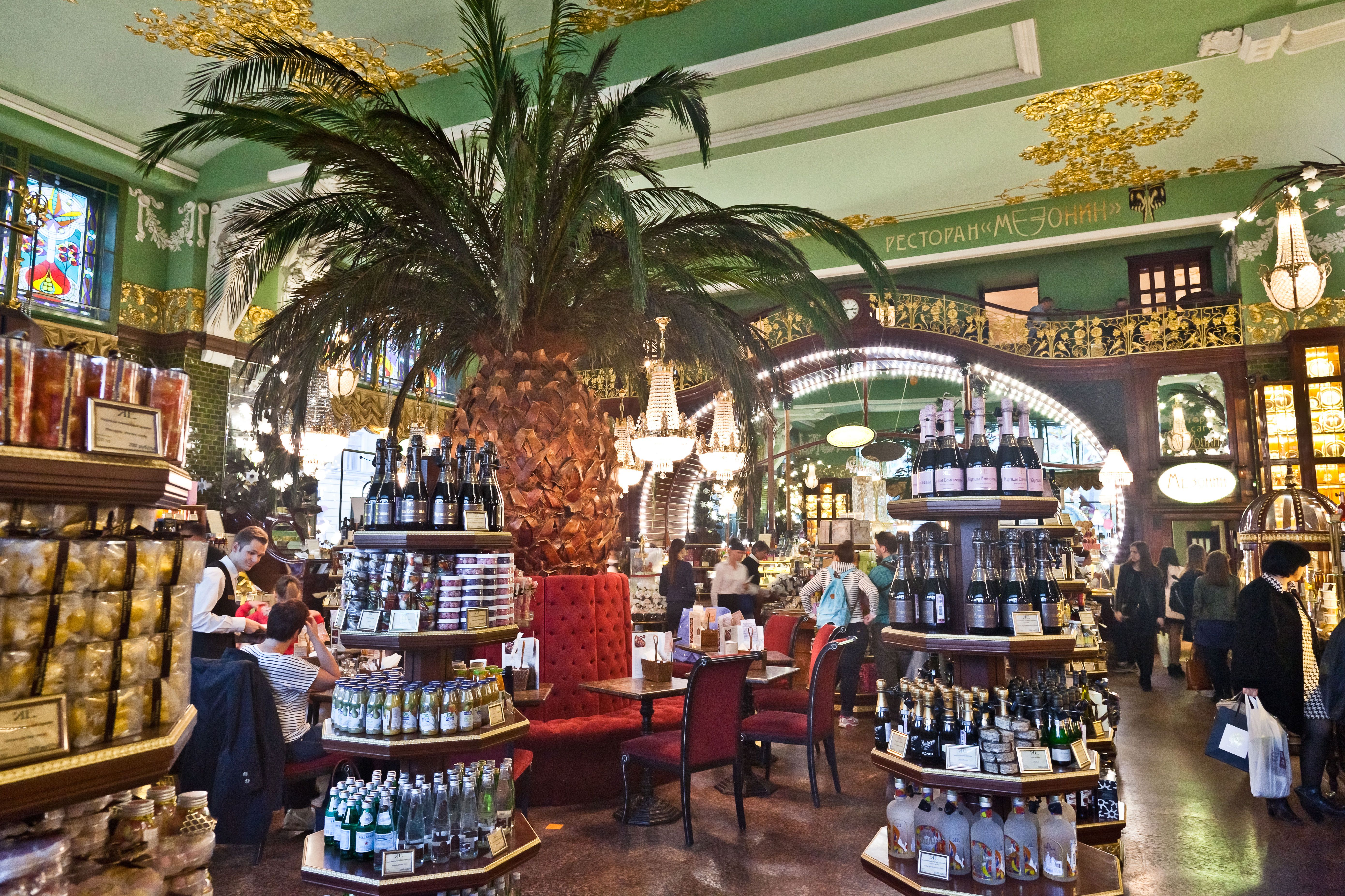Jos haluat aidon pietarilaisen kitsch-kokemuksen, suuntaa Nevski Prospektin ytimessä sijaitsevan näyttävän art deco -rakennuksen katutasossa sijaitsevaan Kupetz Eliseevsin gourmet-ruokakauppaan. Kaupassa kannattaa piipahtaa vaikka vain ihailemassa suklaasta ja marsipaanista tehtyjä korkokenkiä vitriinissä, katon kultalehtisiä auringonkukkaornamentteja ja luksusta henkivää vanhan maailman tunnelmaa. Kahvilatilaa hallitsee kristallikruunuin koristettu ananaspalmu, jonka alla pientarilaiset turkisrouvat siemailevat liikkeen omaa kuohuviiniä tai teetä. Taustamusiikin sijaan kahvilasalissa kaikuvat automaattiflyygelistä kantautuvat sulosävelmät.