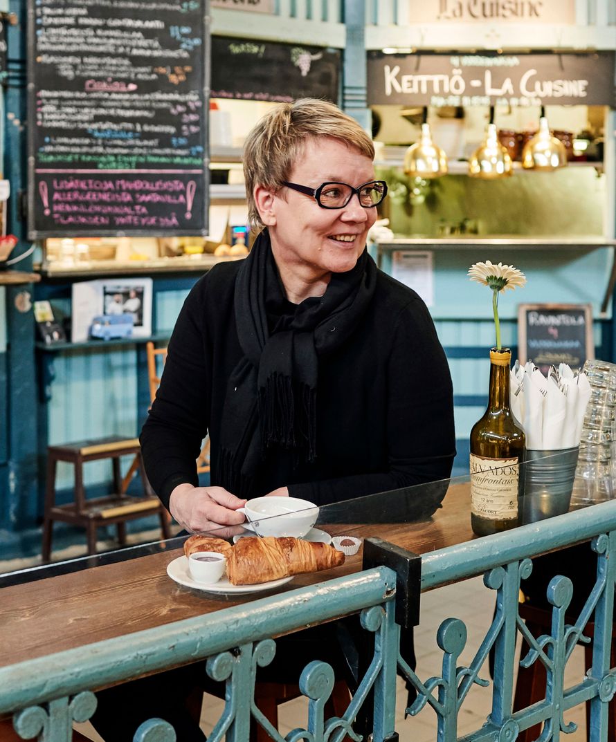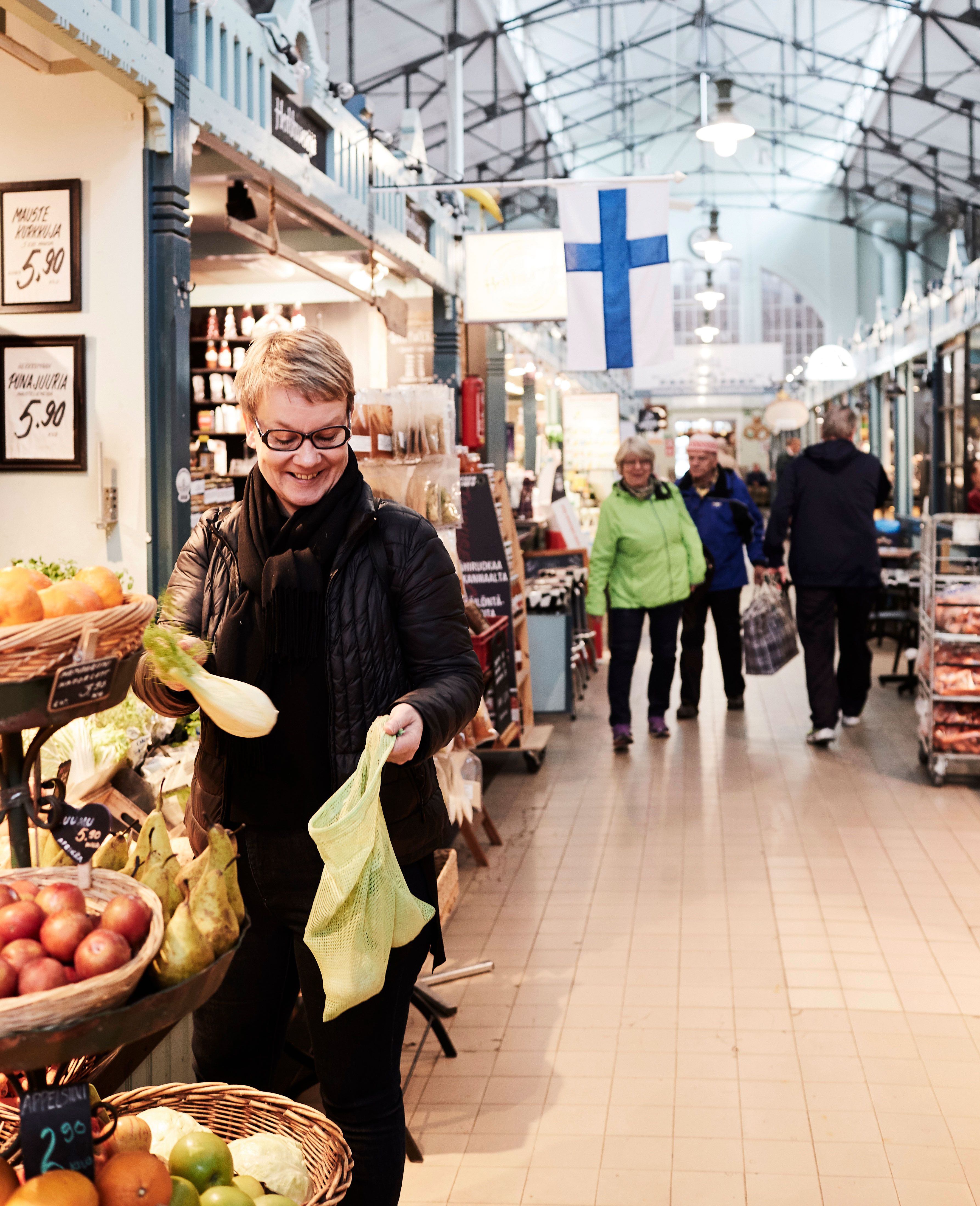"Kymmenen vuotta hain lounaani kauppahallin Neljästä Vuodenajasta, ja mieheni kanssa ostamme ruuat pääosin hallista. Marketeissa emme oikeastaan käy. Muovijätettä kertyy todella vähän, kun voi ostaa liki kaiken ruuan sopivan kokoisina erinä paperiin pakattuna. Minulla ei yleensä ole ostoslistaa vaan suunnittelen ruokalistan lennossa sen mukaan mitä on tarjolla ja sillä hetkellä parhaimmillaan. Lihat ostan Herkkuveräjästä tai Laatulihasta, kalat Nygreniltä ja vihannekset Valliukselta. Kaupungin parasta sushia saa Sushibar Umamista. Ravintoloissa en tilaa useinkaan lihaa, sillä parempaa vastinetta rahalle saan hallista ostetulla lihalla, jonka valmistamme mökillä hiiligrillissä."