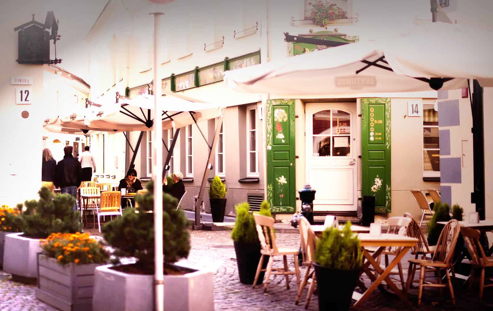 Vilnan vanhoilla kujilla on ravintoloita ja oluttupia vieri vieressä. Viikonloppuisin liikenne suljetaan ja ravintoloitsijat nostavat pöydät ja tuolit kadulle.