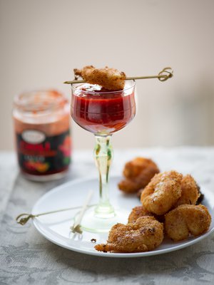 Friteeratut kookos-jättiravut Buga´s Sweet chili kastikkeella