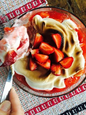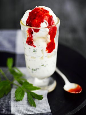Lipstikkajäätelö ja rosmariini-mansikkakastike
