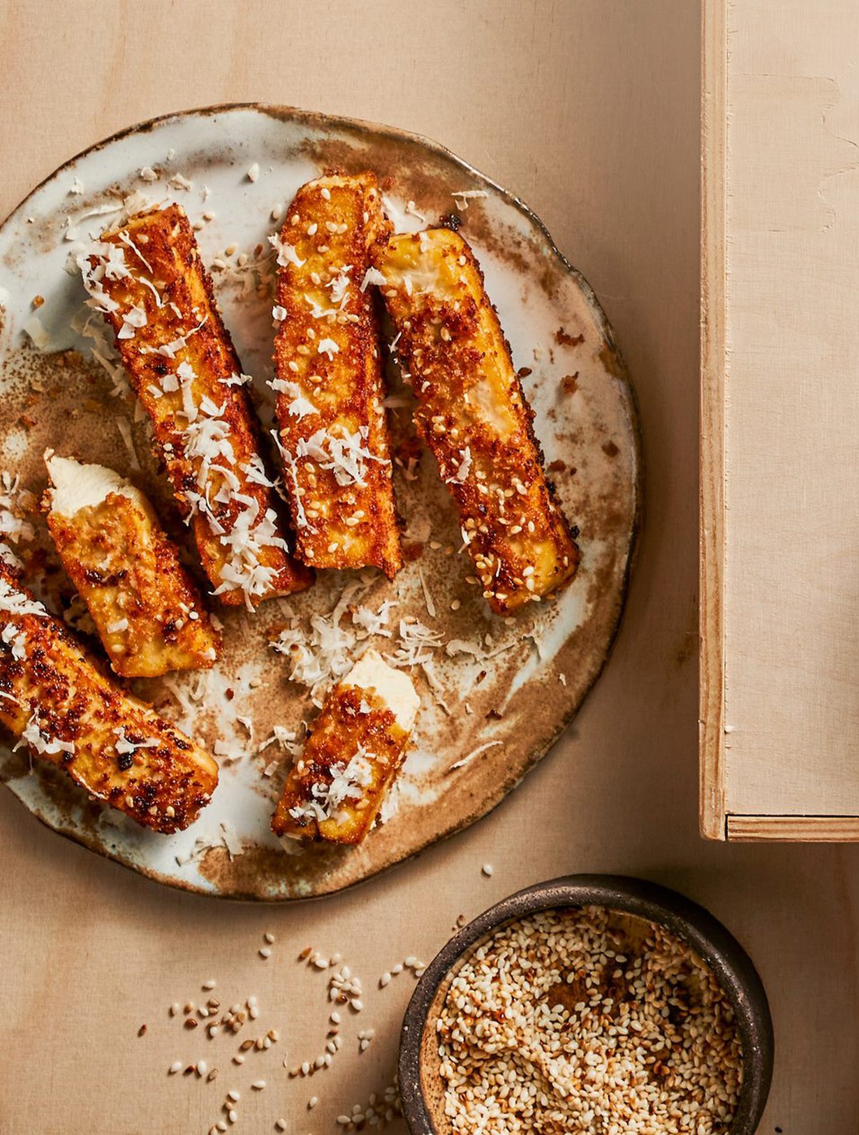 Leikkaa tofuviipaleet sentin paksuisiksi tangoiksi ja pyörittele teriyakikastikkeessa. Anna maustua 10 minuuttia. Pyörittele tofut pankojauhoissa ja seesaminsiemenissä.