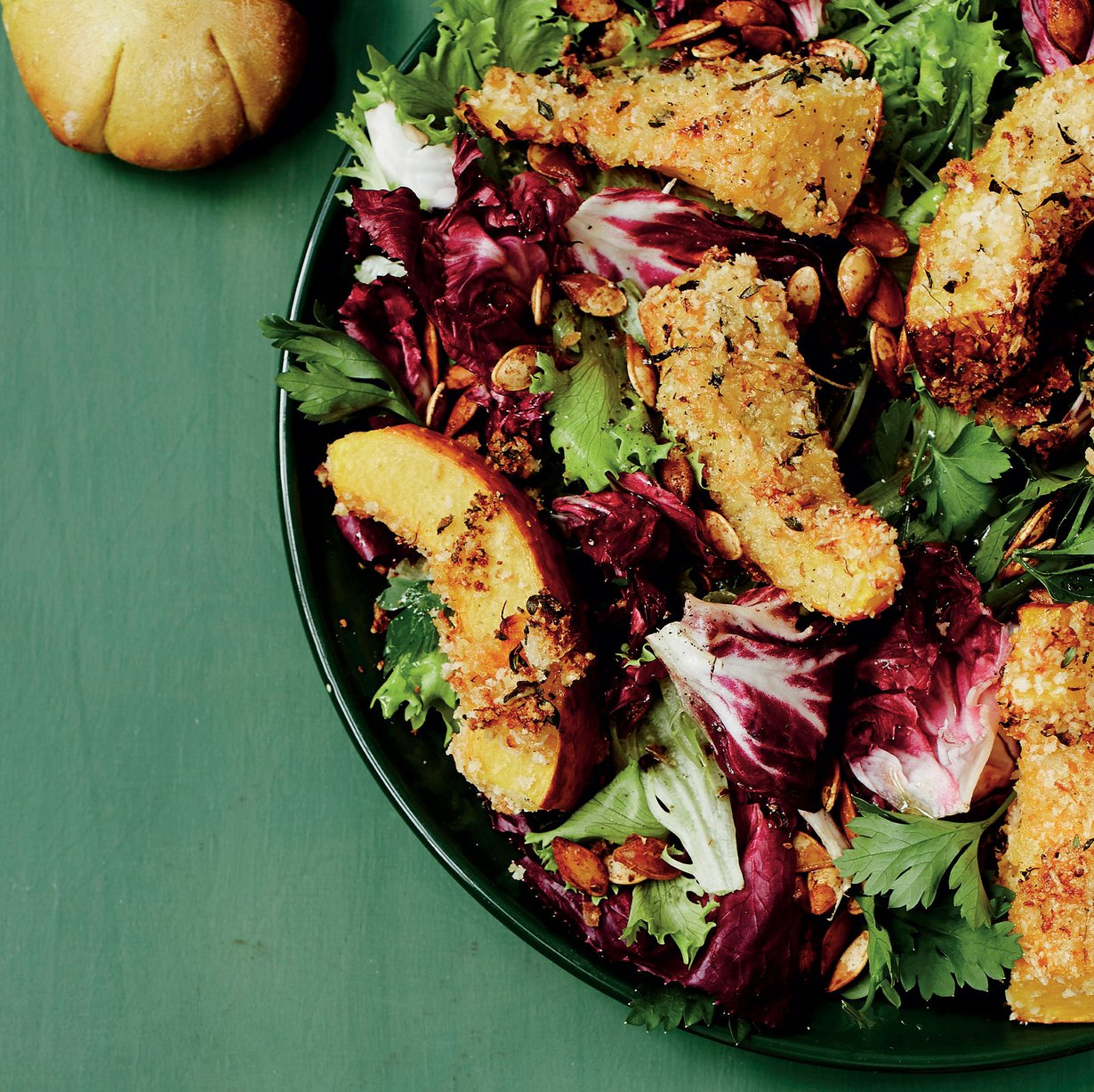 - Yhdistä ison kulhon pohjalla salaattia varten öljy, sitruunamehu ja hunaja. Sekoita ja mausta suolalla. Lisää joukkoon salaatinlehdet ja lehtipersilja. Kumoa tarjoiluastiaan. Nosta päälle rapeiksi paahtuneet kurpitsaveneet ja maustetut siemenet.