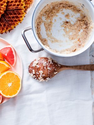 Puurontähteet jalostuvat vohveleiksi, jotka maistuvat paksun jugurtin ja raikkaiden sitrusten kanssa.
