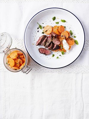 Karitsan sisäfilee, valkosipuliporkkanat ja jogurttikastike