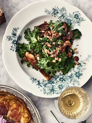 Puhdista ja leikkaa herkkusienet neljään osaan. Leikkaa punasipuli ohuiksi viipaleiksi ja hienonna valkosipulinkynsi sekä lehtipersilja.