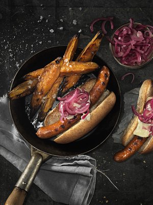 - Kokoa pihvi ja täytteet bataattiviipaleiden väliin.