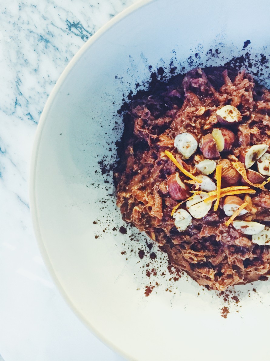- Koristele annos kaakaojauheella, rouhituilla hasselpähkinöillä ja appelsiinin kuoriraasteella.