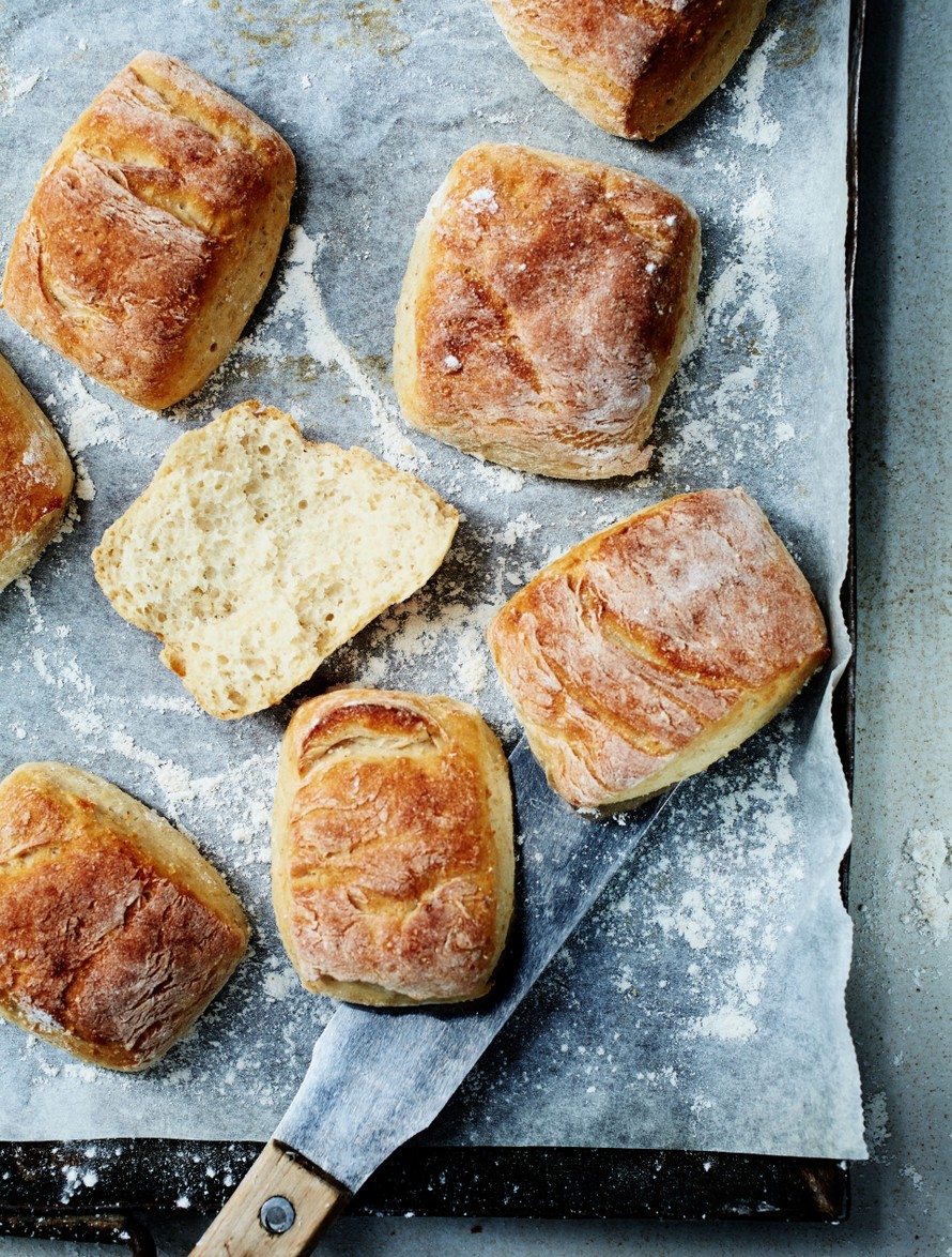 - Kaada taikina gluteenittomilla jauhoilla jauhotetulle työtasolle. Muotoile taikina tangoksi ja leikkaa tangosta 12 sämpylää leivinpaperin päälle uunipellille.