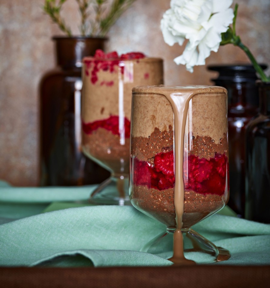 - Valmista ensin kookos-suklaakerros. Sekoita kulhossa kookosmaito, chia-siemenet, kaakaojauhe ja hunaja.