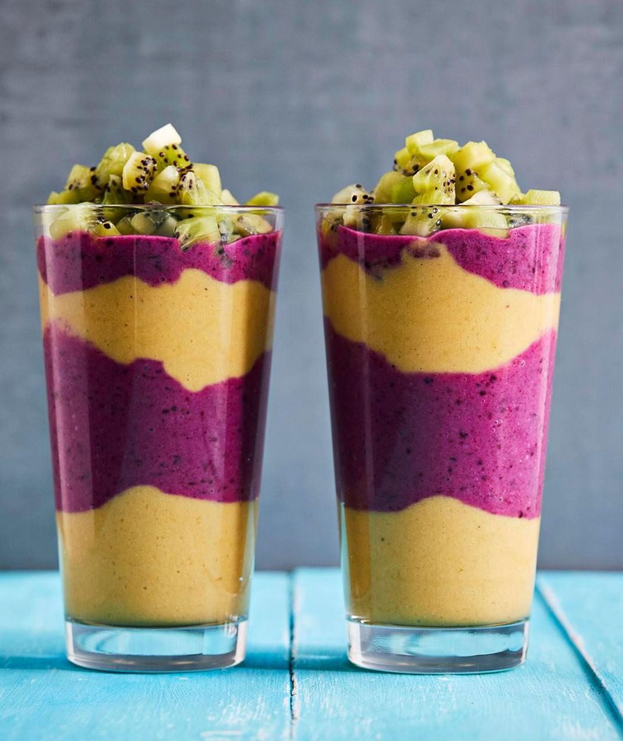 Mittaa banaanit, mango, kauramaito ja kaurajauhe tehosekoittimeen. Soseuta tasaiseksi. Kaada noin puolet juomasta erilleen toiseen kannuun.