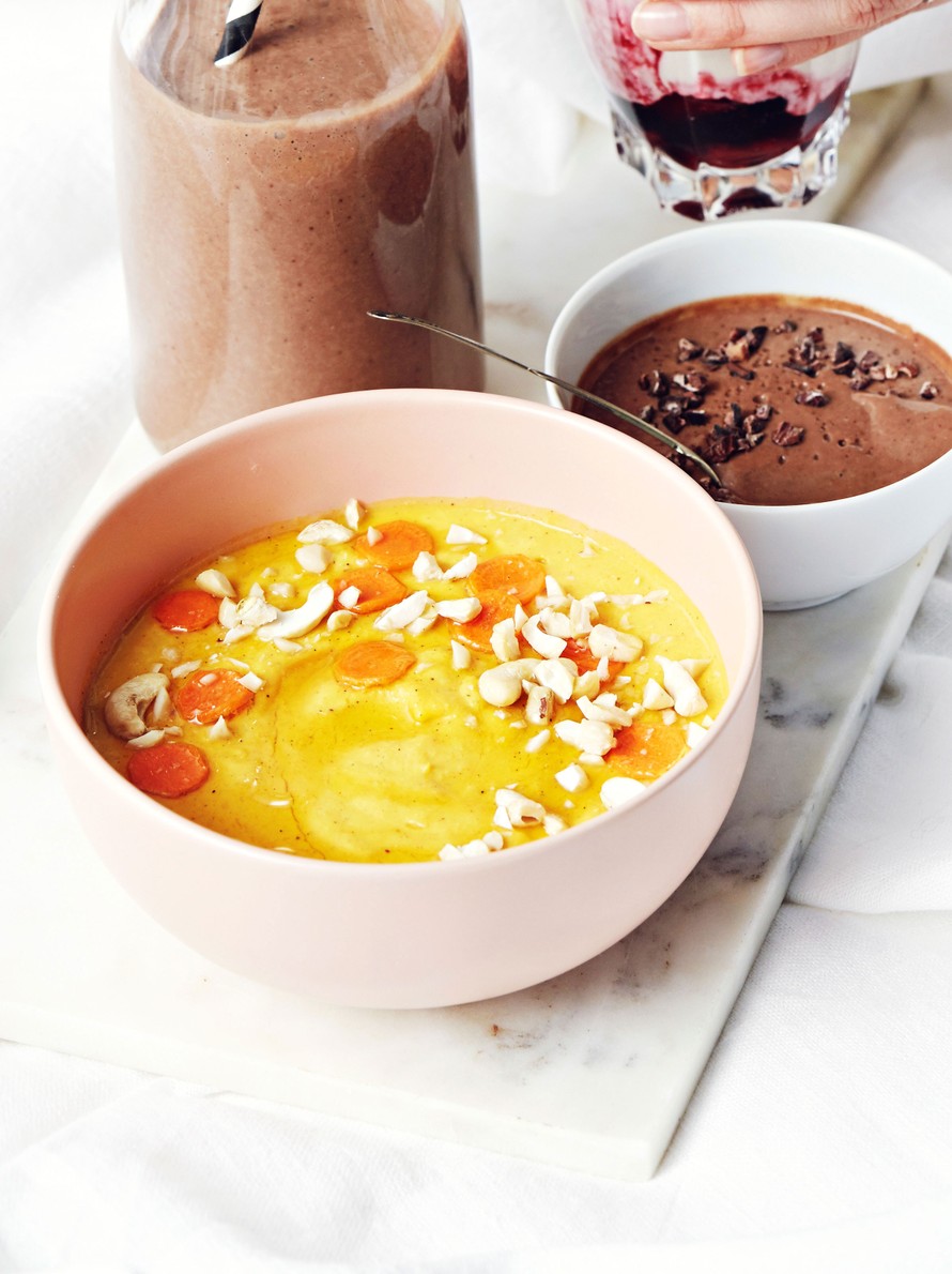 Smoothiesta tulee supersamettinen, jos laitat pähkinät likoamaan veteen yöksi. Saat porkkanasta ohuita koristeviipaleita kuorimaveitsellä.