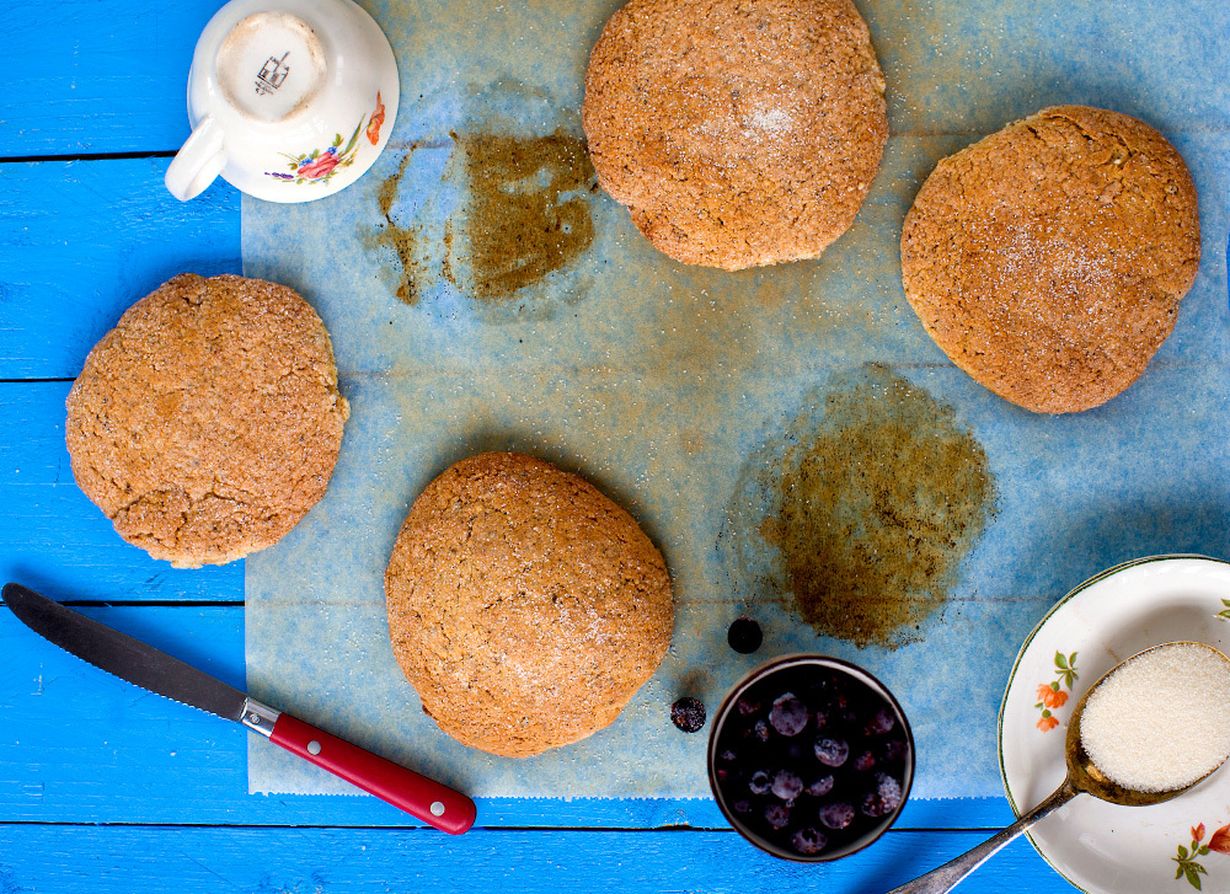 - Ohjeesta tulee kahdeksan skonssia. Pyöritä taikinasta palloja ja pyörittele pallot sokerissa. Paina kakkusiksi leivinpaperin päälle pellille. Paista enimmillään viisi skonssia samalla pellillä, sillä ne leviävät uunissa.
