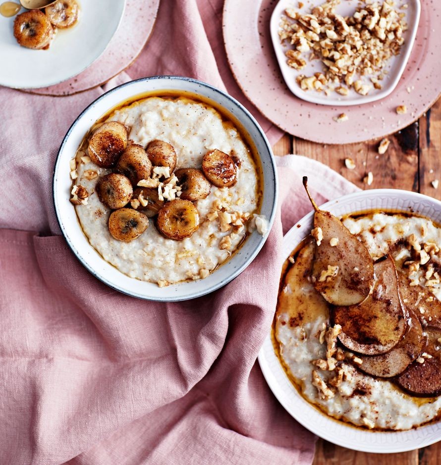 - Kauho puuro lautasille ja nostele hedelmät päälle. Lusikoi pannulta kaikki voi ja siirappi mukaan. Viimeistele pähkinärouheella.