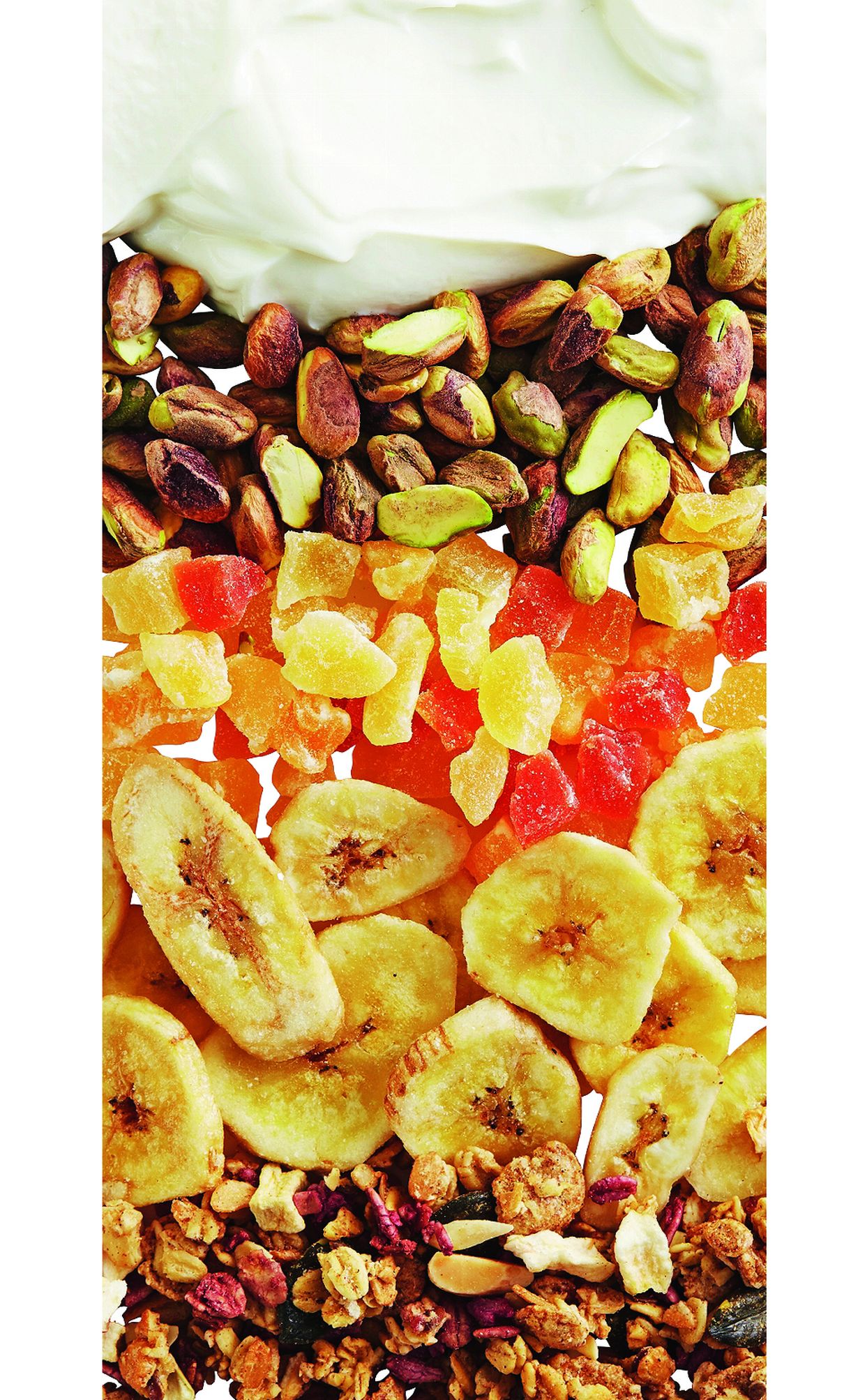 - Sekoita rahka kuohkeaksi. Lisää kuivattu hedelmäsekoitus. Rouhi banaaniviipaleet ja pistaasipähkinät ja sekoita ne rahkan joukkoon.
