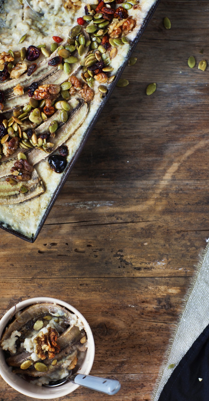- Kumoa puuro uunivuokaan. Laita banaanit puuron pinnalle ja ripottele pähkinäseos päällimmäiseksi. Paista uunissa 15 minuuttia, kunnes pinta on ruskistunut.