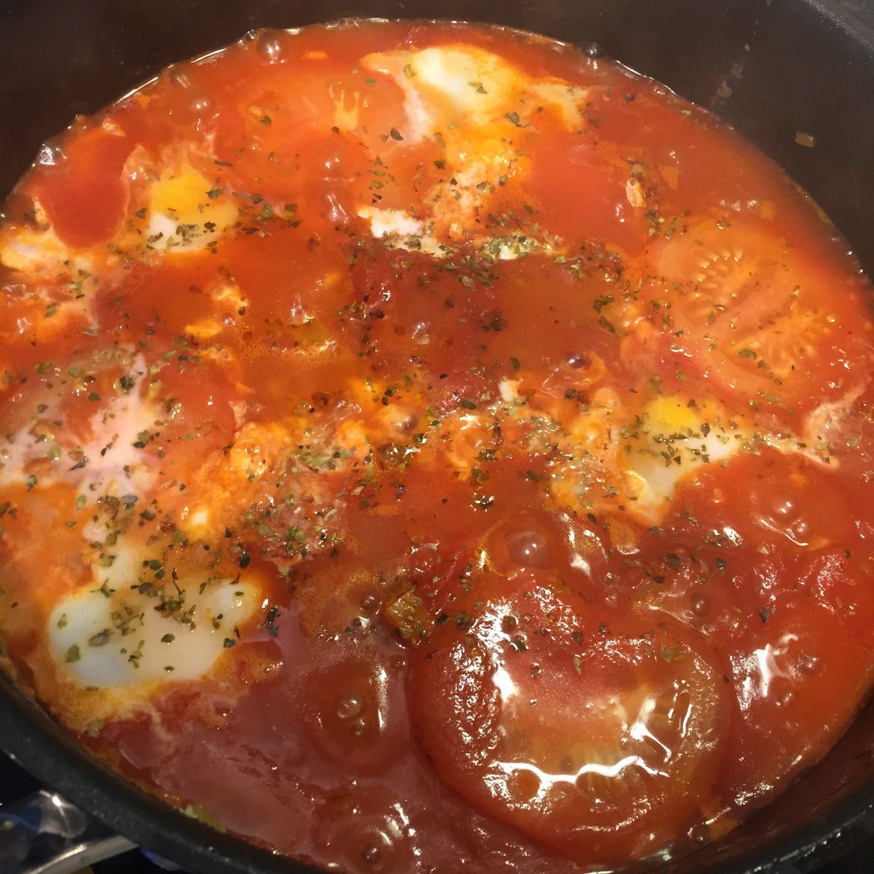 Kun koostumus on sopivan muhennosmainen, maista ja lisää tarvittaessa hieman suolaa ja pippuria. Asettele viipaloitu tomaatti sekoituksen pinnalle. Tee lusikalla tai lastalla pieniä koloja kastikkeeseen ja riko kananmunat niihin. Kananmunat tulisi rikkoa mahdollisimman nopeasti jotta ne saavat suurinpiirtein saman kypsymisajan. Mausta seos esimerkiksi oreganolla, laita kansi päälle ja anna kananmunien kypsyä noin 4-5 min.