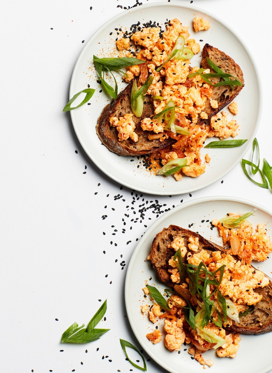 Paahda leipä ja nosta päälle kimchi-kokkelia. Viipaloi päälle vielä kevätsipulia ja ripottele togarashia.