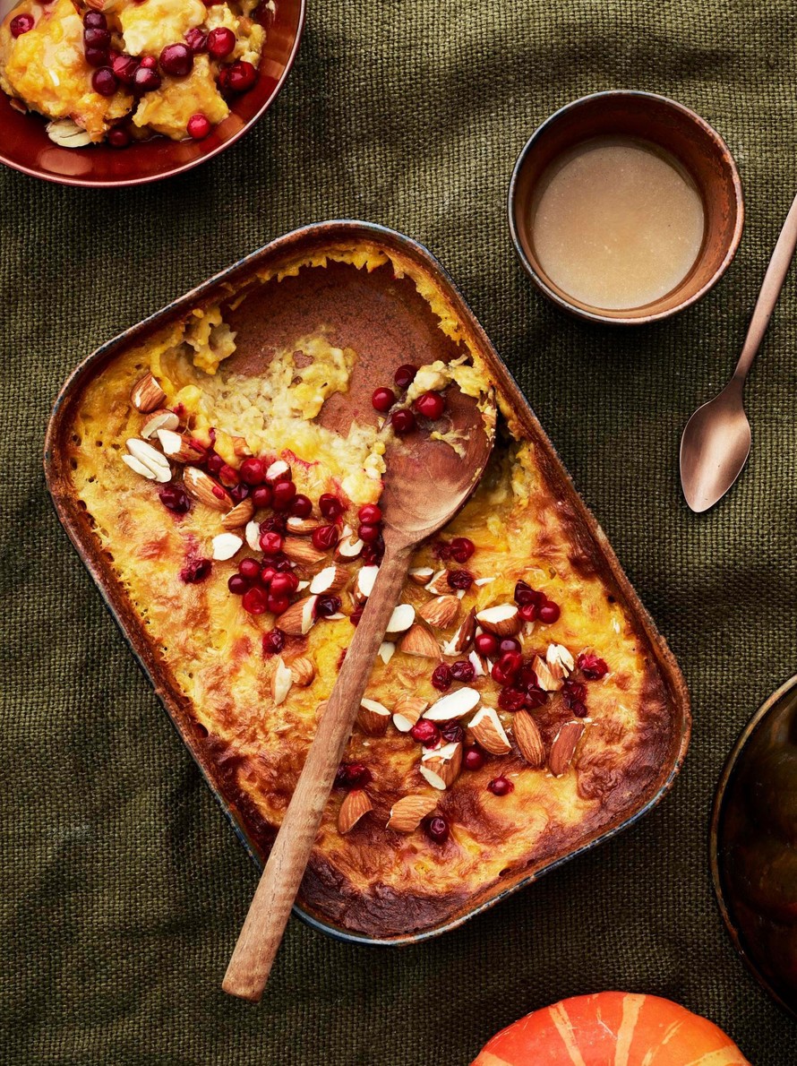 Pitkään uunissa muhinut puuro on täydellinen viikonloppuaamupala. Uunipuuro saa rutkasti lisää luonnetta, kun sen joukkoon sujautetaan kurpitsasosetta ja päälle ripotellaan rouhittuja manteleita.