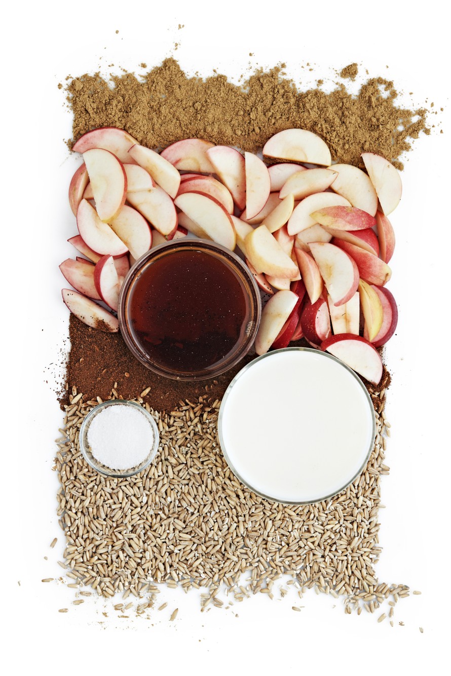 Huuhtele kaurasuurimot ja laita ne voideltuun uunivuokaan tai -pataan. Lisää omenat, siirappi ja mausteet. Kaada lopuksi päälle maito.
