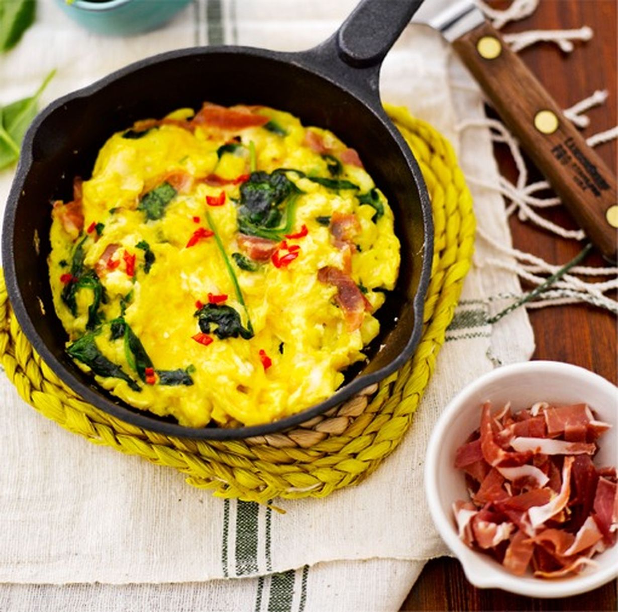 - Riko munat kulhoon ja vatkaa niiden rakenne rikki haarukalla. Lisää maito, kalakastike ja hienonnettu chili tai hiutaleet. Leikkaa kinkku parin sentin suikaleiksi. Kuumenna öljy pannulla ja paista siinä pinaattia noin minuutti.