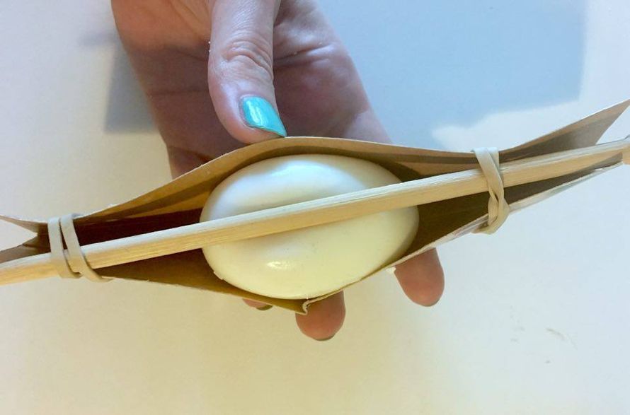 - Kuori muna heti lämpimänä ja aseta se pahvin väliin. Pingota syömäpuikko munan päälle kuminauhojen avulla (kuten alhaalla olevassa kuvassa). On tärkeää, että muna on tässä vaiheessa vielä tuore ja lämmin. Kylmänä se ei kestä painetta, vaan murtuu.