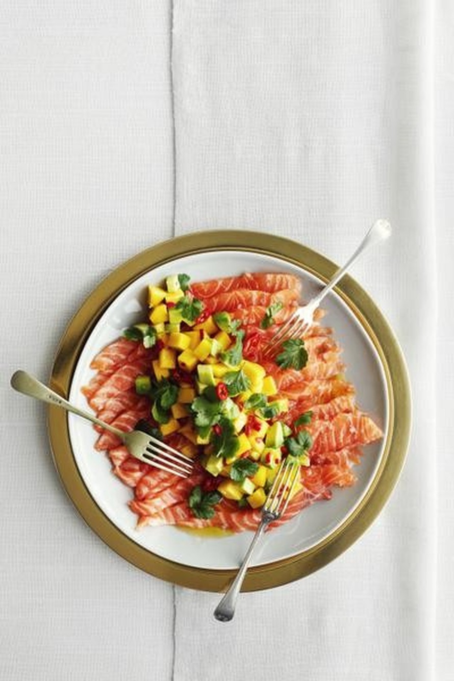 - Yhdistä kulhossa mango- ja avokadokuutiot sekä chili. Kaada joukkoon kastike. Pyyhi kalan pinnasta suola ja kosteus. Levitä kalat tarjoilulautaselle. Nosta mango-avokadosalaatti lohiviipaleiden päälle. Koristele tuoreella korianterilla. Tarjoa rapean maalaisleivän kanssa alkuruuaksi.