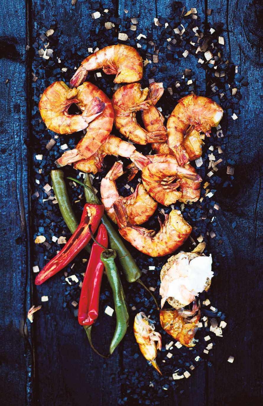 - Sulata katkaravut jääkaapissa. Leikkaa chileihin pitkittäisviillot, poista siemenkodat ja valkoiset kalvot. Nosta katkaravut ja chilit ritilän päälle savustuspönttöön. Voit myös valmistaa katkaravut savustuspussissa grillissä. Savusta 10–15 minuuttia.