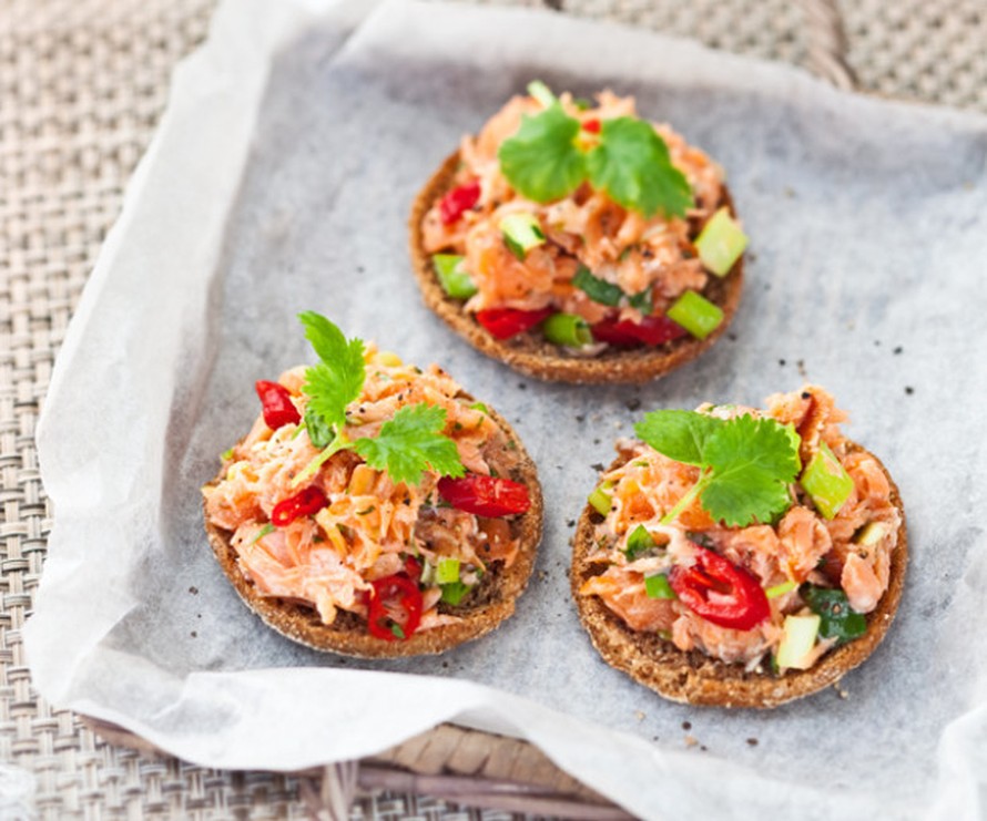 - Lisää mehu ja öljy. Anna maustua hetken jääkaapissa. Tarjoa ruisnappien päälle alkupalana.