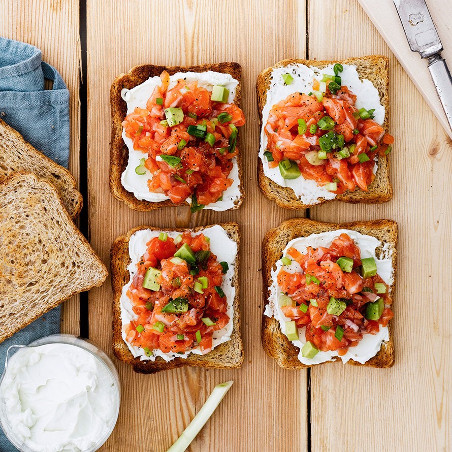 - Paahda paahtoleivät. Sipaise leipien pintaan tuorejuustoa. Lusikoi kalahaketta paahtoleipien päälle ja ripottele päälle avokadot.
