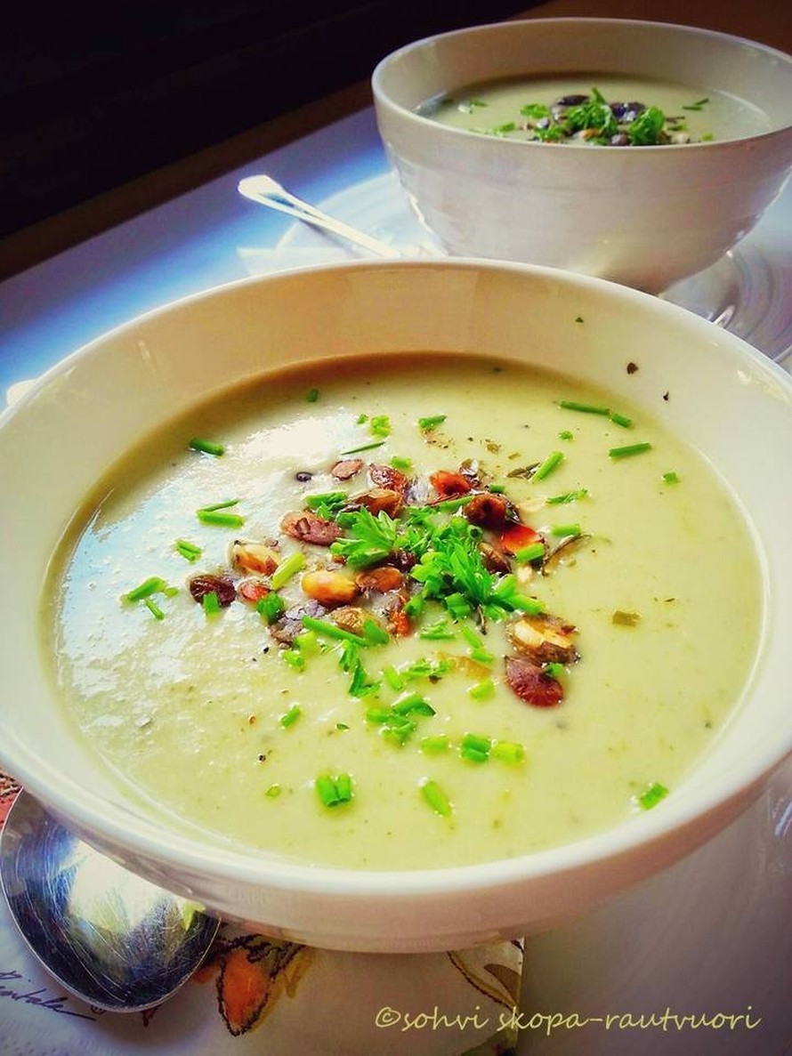 Freesaa pilkotut kasvikset voissa. Lisää kasvisliemi ja keitä n. 15 minuuttia kunnes kukkakaalit ovat kypsyneet. Lisää sulatejuusto ja anna sulaa. Soseuta ja tarkista maku. Ripottele päälle paahdettuja, rouhittuja pähkinöitä ja silputtua ruohosipulia.
