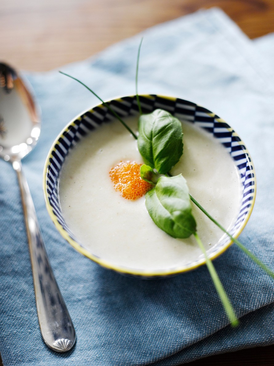 - Soseuta keitto ja tarkista maku. Lisää ripaus pippuria sekä ranskankerma ja anisviina.