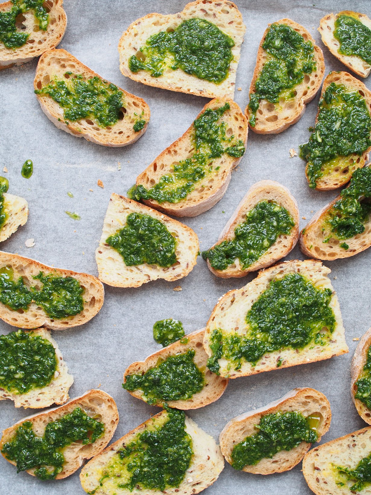 Jaa yrttitahna leiville ja paahda grillissä tai 200-asteisessa uunissa noin 10 min, kunnes leivät ovat rapeita.