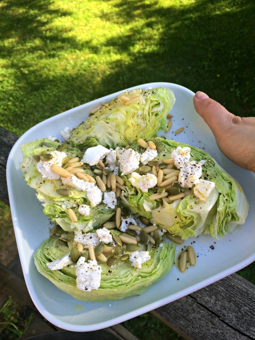 Eli lohko jäävuorisalaatti osiin esim. pieni jenkki kuutioituu 4-6 osaan. Murustele päälle pehmeää vuohenjuustoa, ripottele siemenet, heittele vähän suolaa ja rouhi mustapippuria. Lorauta balsamicoa ja oliiviöljyä. Se olis siinä kuulkaas kaikki maan asukit, ehkäpä helpoin salaatti evör.