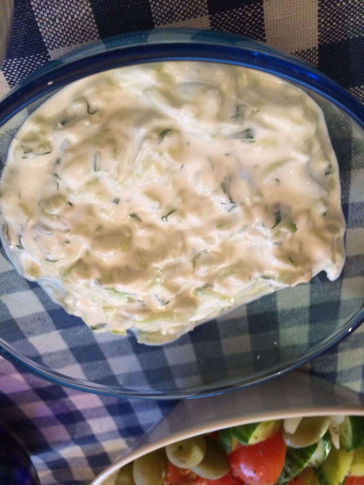 Kuori kurkku ja raasta karkeaksi raasteeksi. Purista raasteesta enimmät vedet käsin pois. Silppua tilli. Sekoita jogurttiin kaikki ainesosat. Anna makujen tasaantua jääkaapissa hetken ennen tarjoilua.